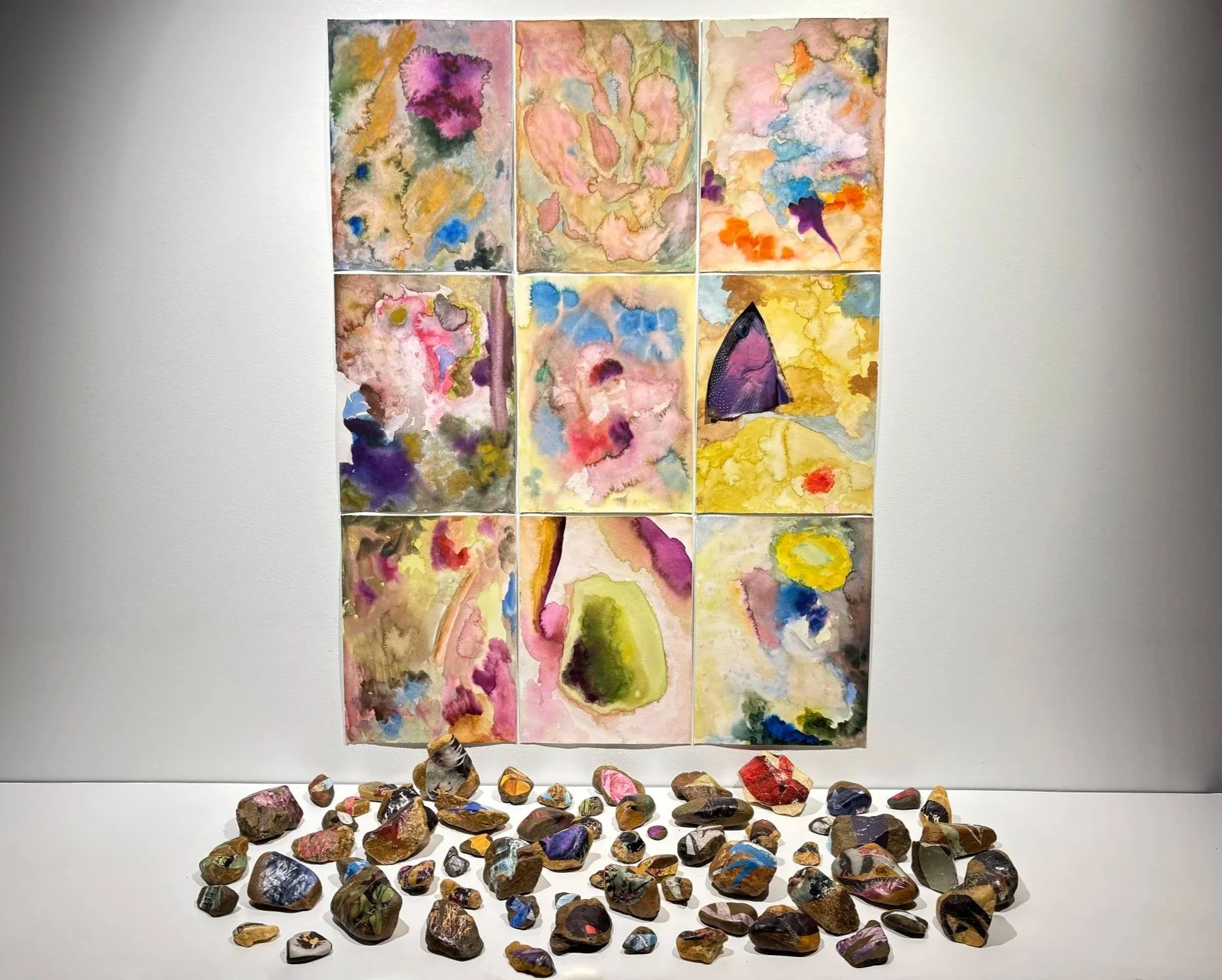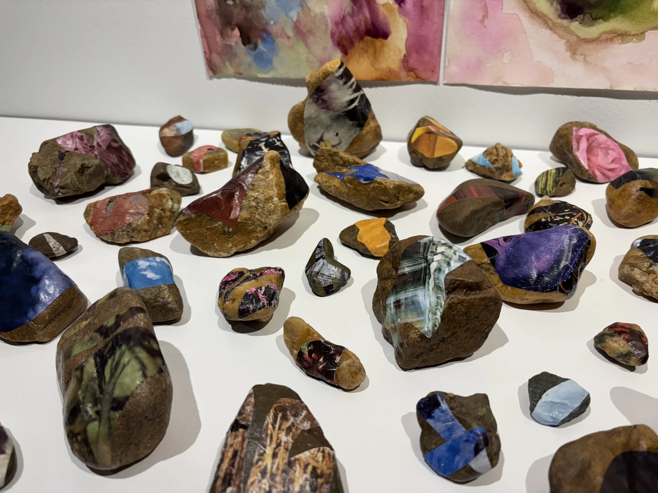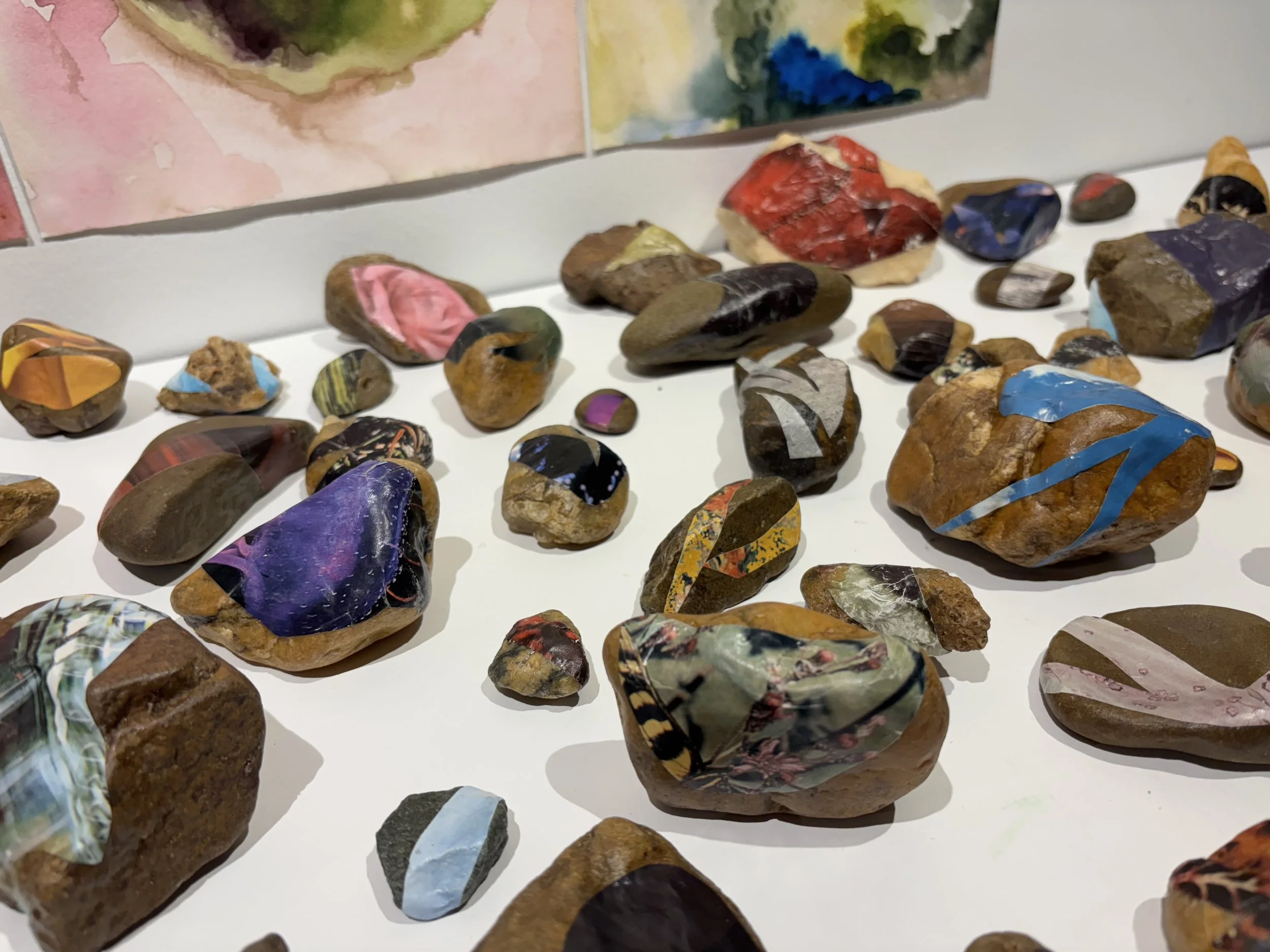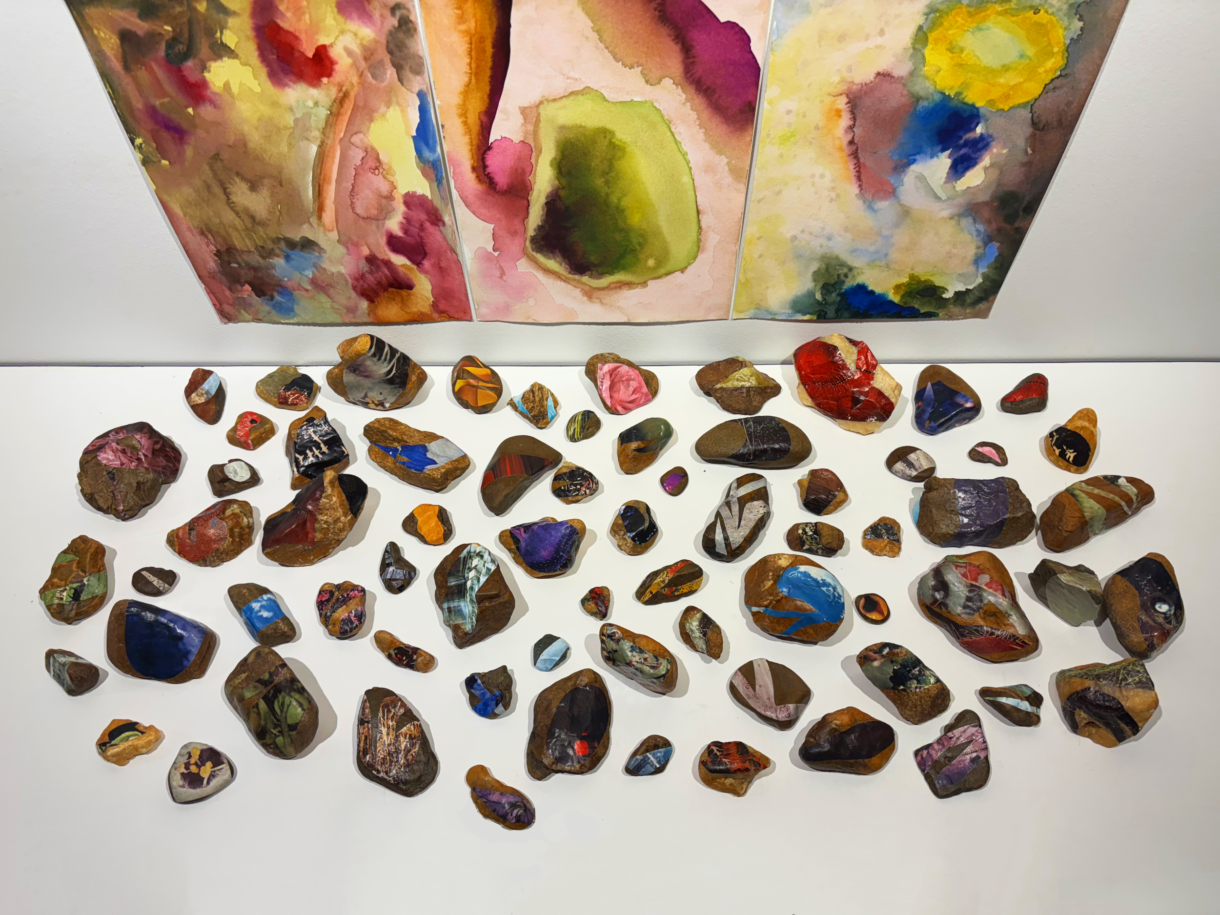 I’ve grown up alongside the Rivanna River in Charlottesville, Virginia. She raised me, taught me, kept me safe, and generously loved me. I care for the river. To me, the river is certainly not an it, but a who. Her personhood is a matter of the heart, not the law. This artwork is co-created with the Rivanna River and embodies our relationship; her contributions of rock and water go beyond pure physical material. An artistic setting brings attention to her masterful shapes, colors, and movements. She tells her stories herself; the patterns of flow and evaporation, the time it took to fracture or smooth a stone's surface, the geology and hydrology of a region filled with history and memory. The Rivanna River made this artwork as much as I. The touch of both human and water are present and dancing together.