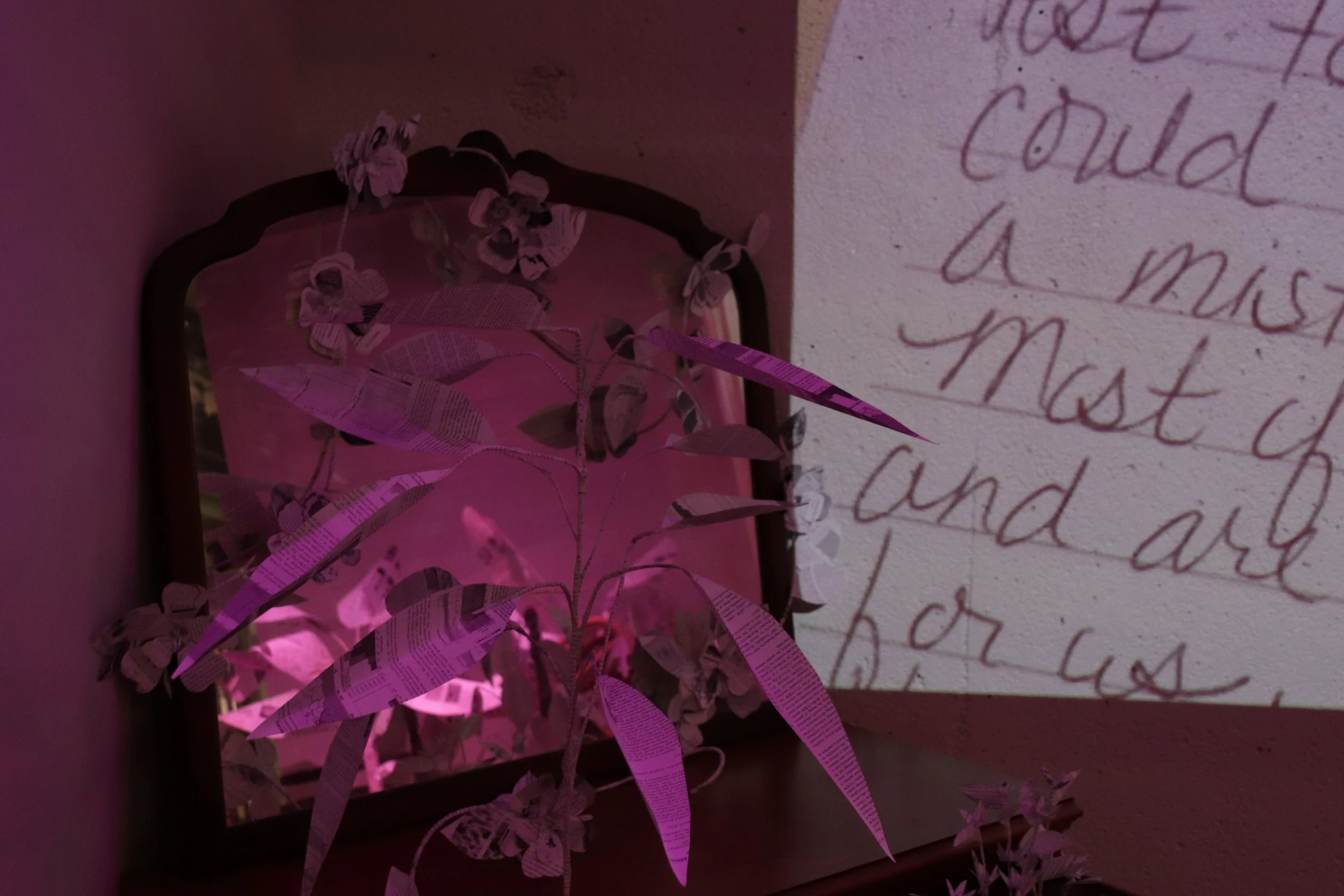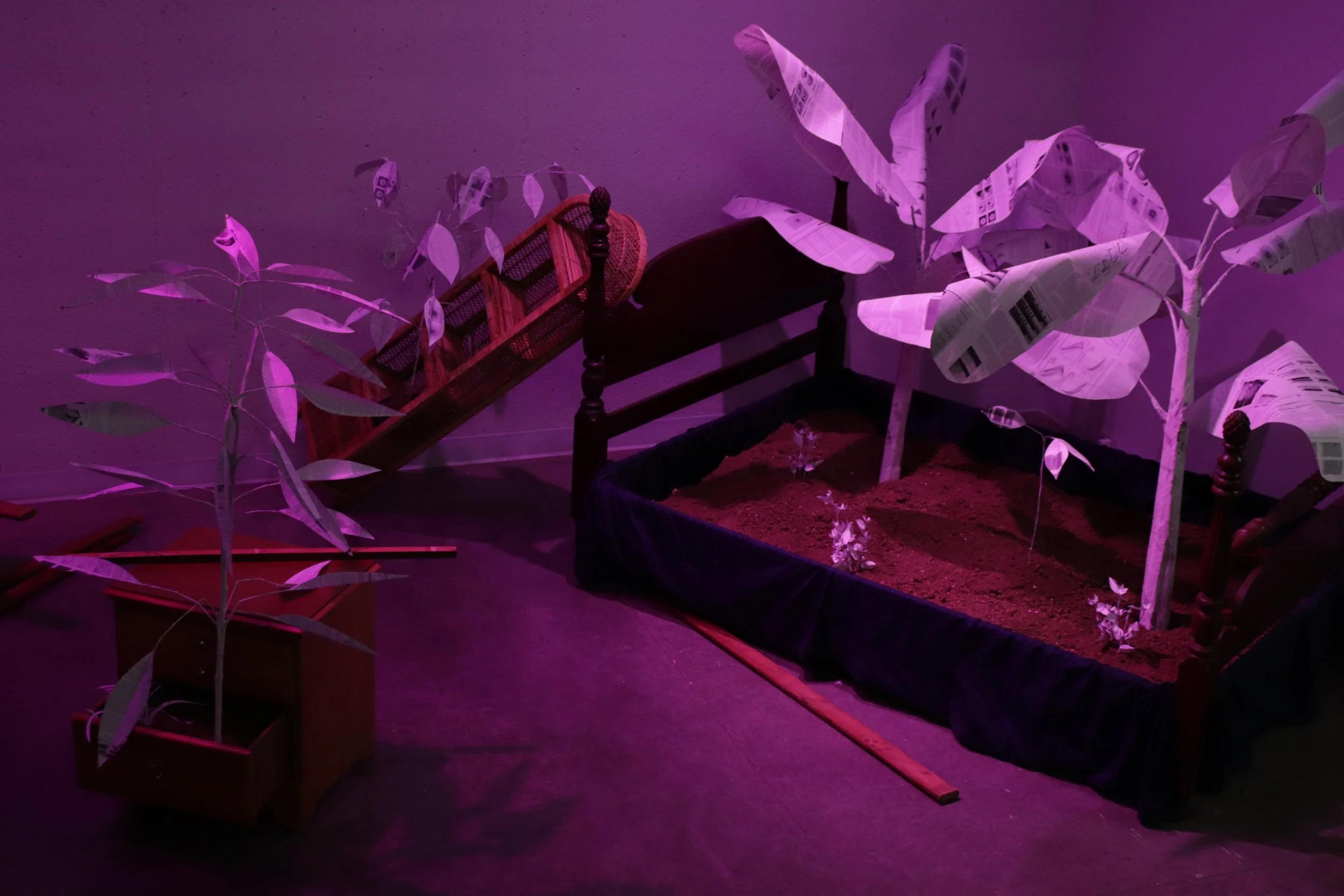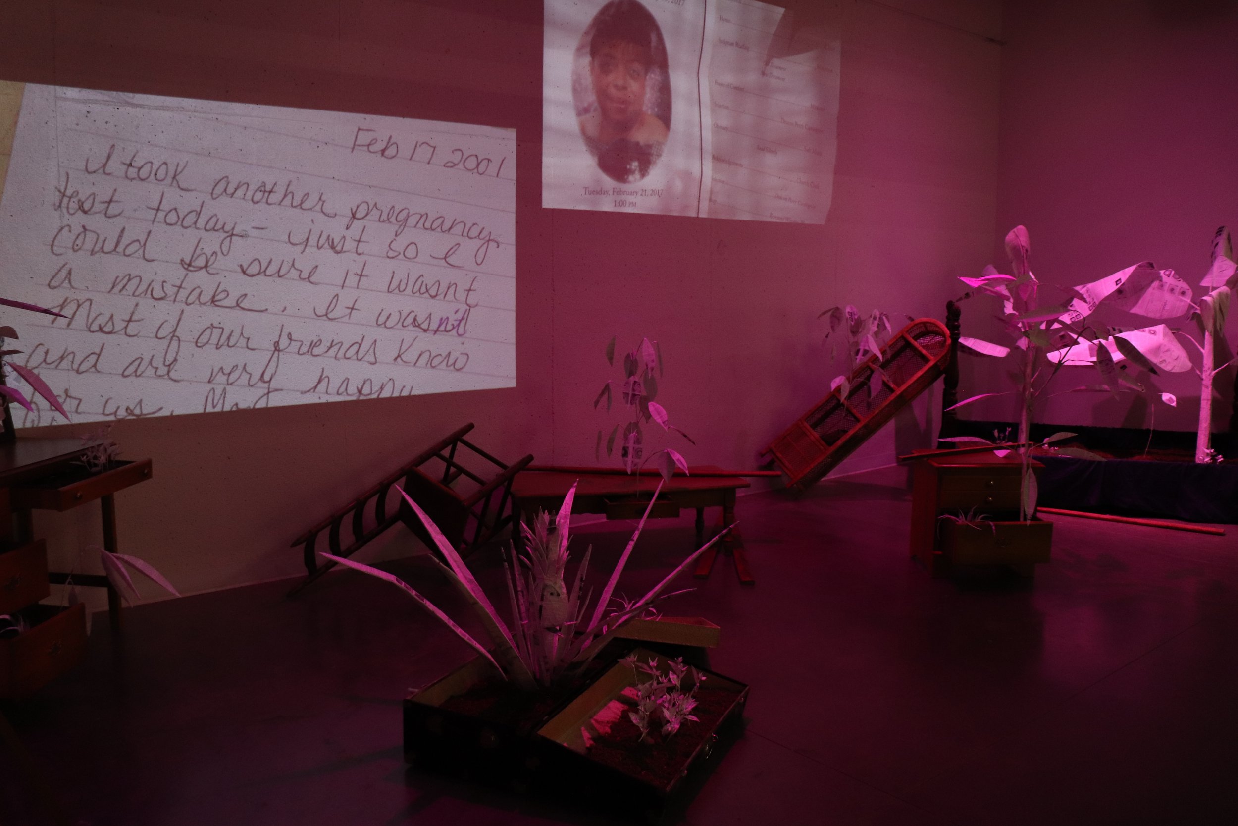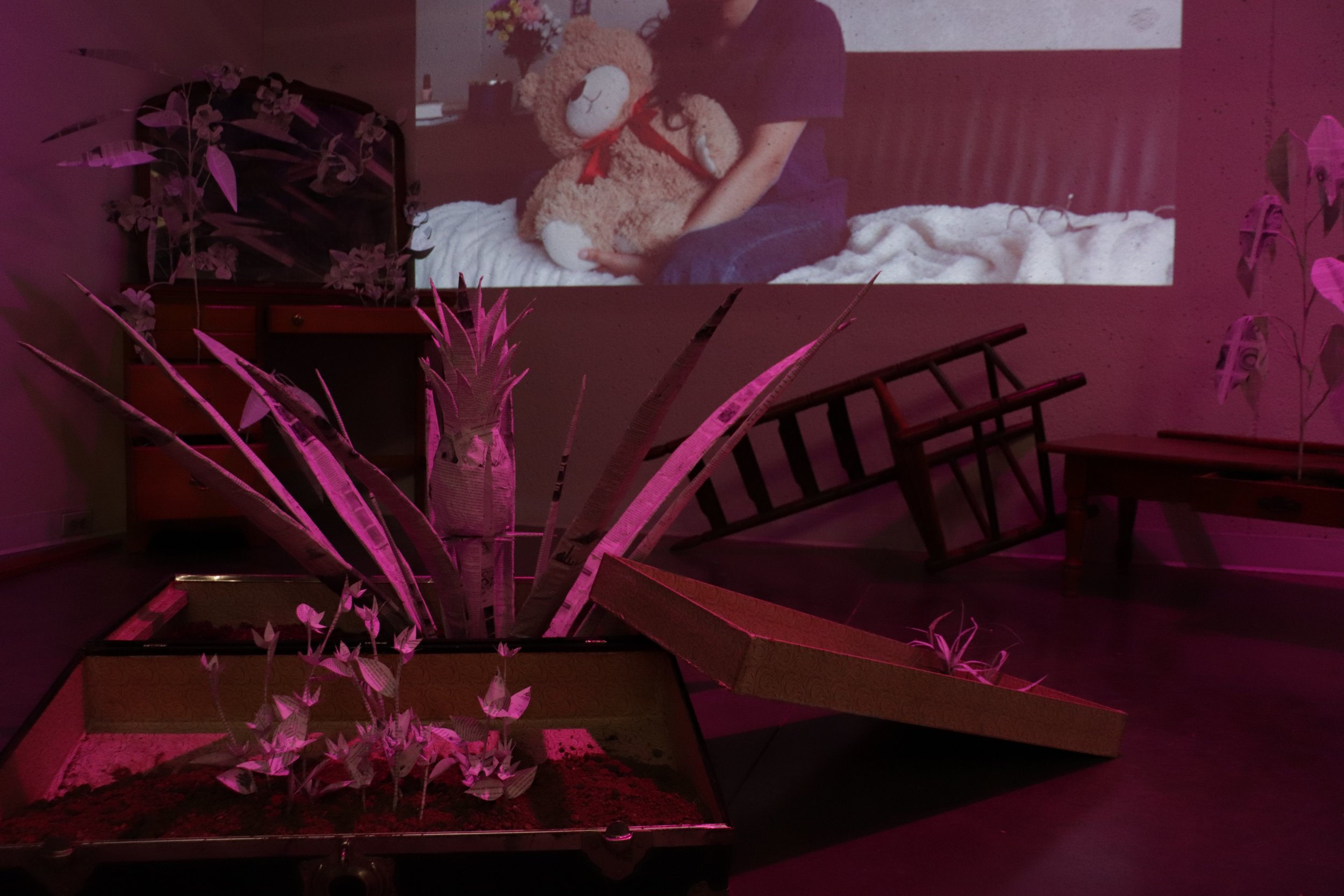 Banana, mango, avocado, vine, and flower plants overtake the toppled installation furniture as if time has passed, and the natural succession of growth after disaster has emerged once again. The plants are constructed using peer-reviewed hurricane research papers, published by University of Miami atmospheric scientists. It was important to me to feature climate science coming out of Florida, because it is one of the most restrictive states regarding environmental policy, education, and action; even the words “climate change” are banned from state law and school textbooks. To plant this research and these ideas in the dirt, to give them roots, is an act of nurturing climate science and ensuring its future, even through displacement. It is also a way to cope with loss by attempting an act of revival, finding growth within tragedy. The video and audio you hear come from interviewing local community members here in Charlottesville, prompting them with the question: What is the most irreplaceable object in your home?