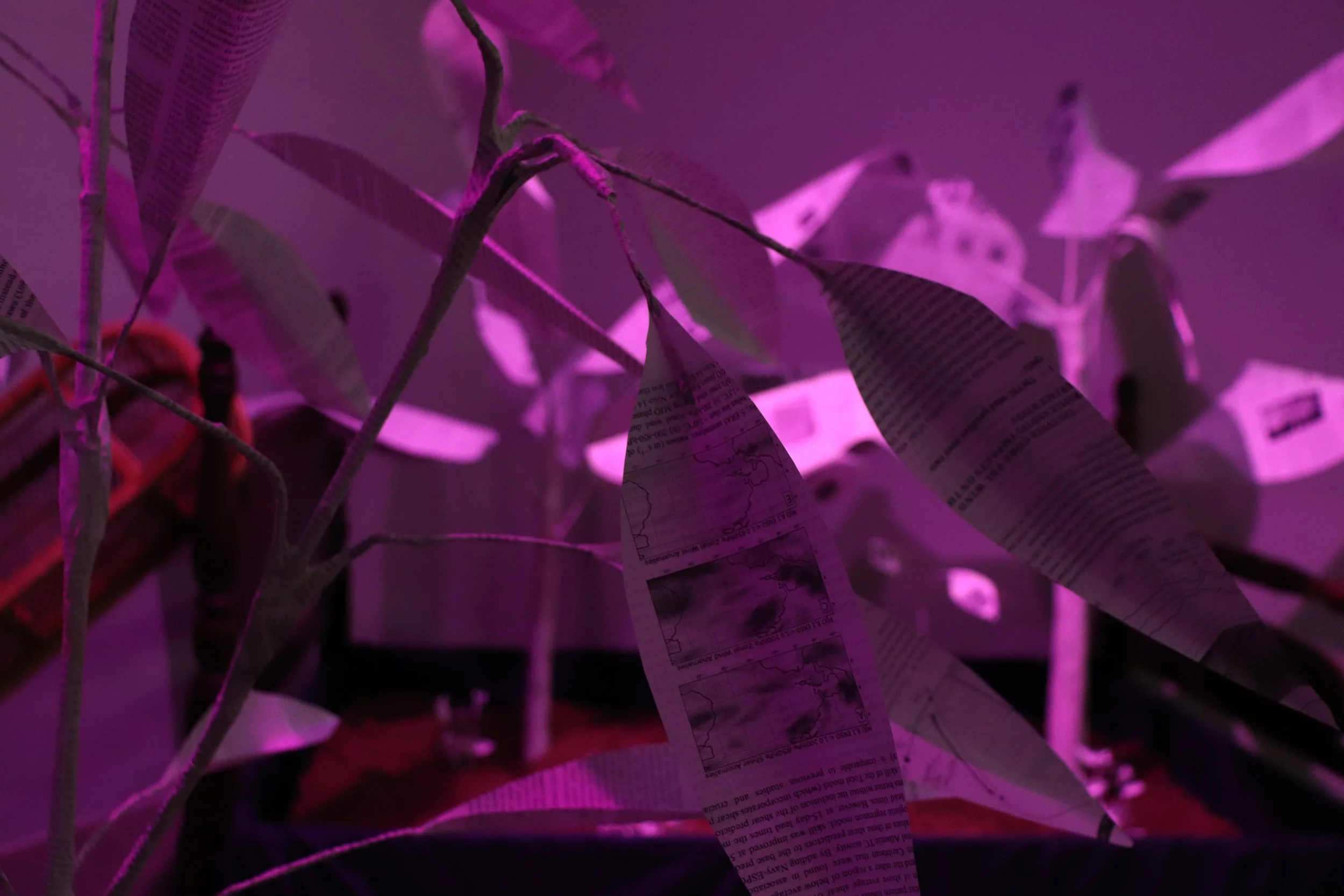 The concepts of planting, gardening, and cultivating are deeply tied to our humanity and our stories of life, meaning, and morality. This thesis project recontextualizes science media as a living beings. Research papers are taken out of their typical, hidden environment and transform them into sculpture, a medium the general public knows how to engage with. In the installation, anyone can walk among climate research; they can gaze, inspect, hear, and see the papers come alive. Data becomes emotional and aesthetic information, restoring some of the subjectivity and creativity that objective, rigorous Science tries to strip away. Phrases and figures are at once legible and intact, while also being blended into a new aggregated medium and composing a new whole; one that creates an environment, an experience, and emotion. The sculptural interpretation complements and expands an academic interpretation of the same material to encourage new methods of analysis and empathy. This work carves out a space for the individual to feel like they are a part of environmental science conversations. I hope to push them to understand that the dots, lines, and charts are not just symbols or design, but that we–all of us–are the data points: our families, friends, followers, teachers, and neighbors. Environmental science is for and about the everyday person, telling the collective story of all entangled species and systems.